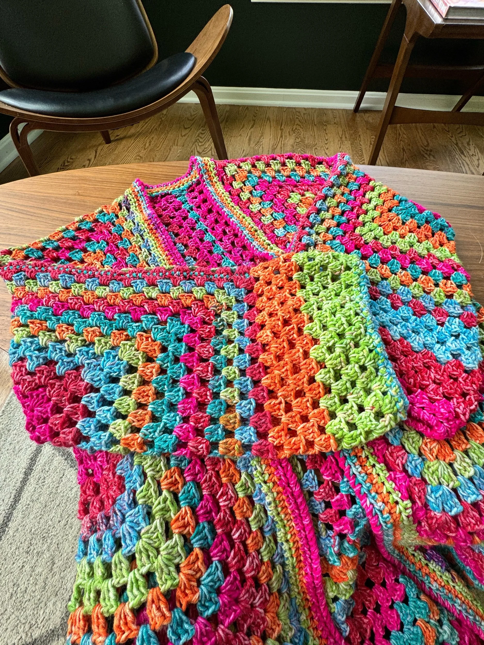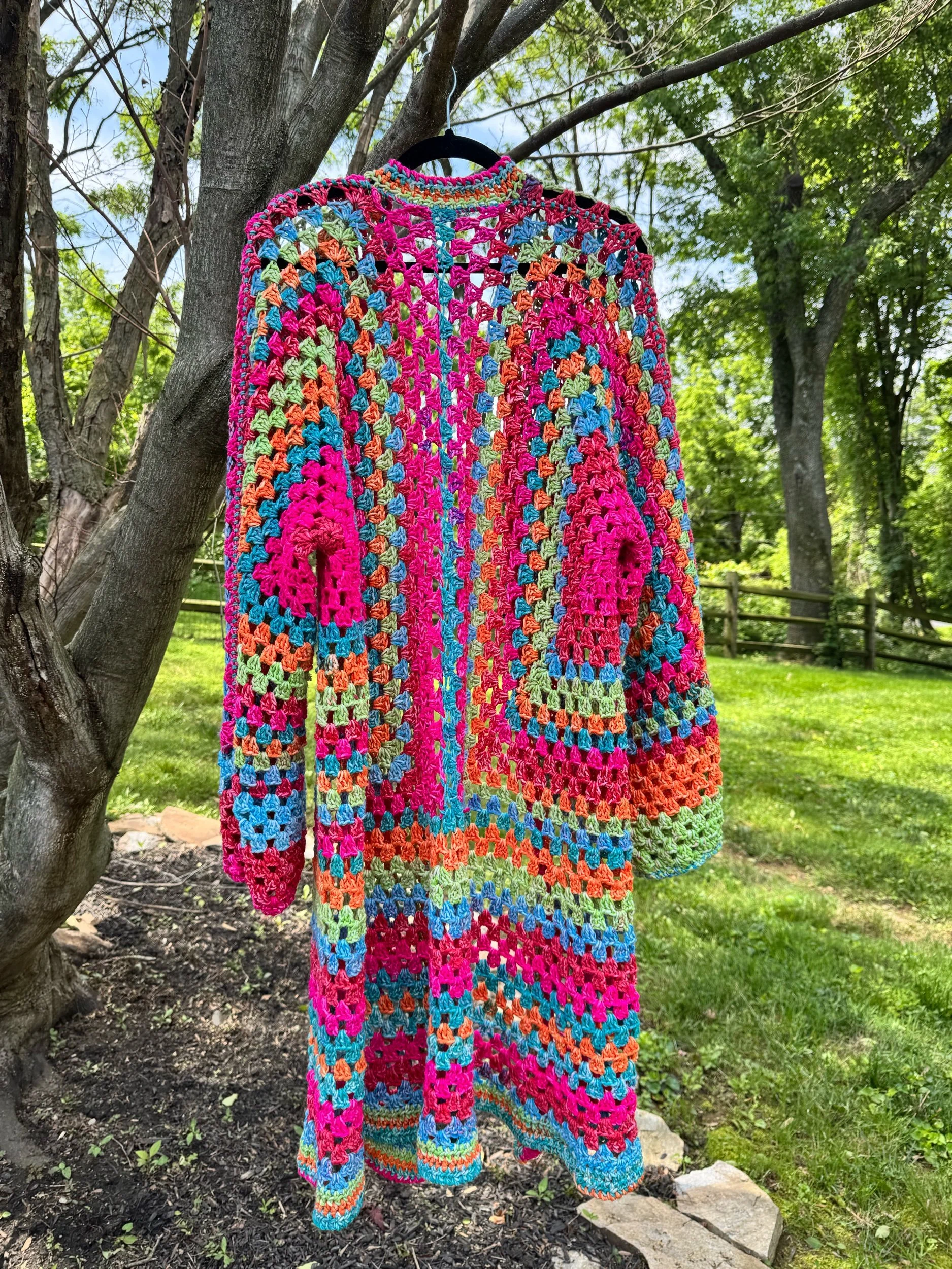 Wrap yourself in a technicolor daydream with this one-of-a-kind, hand-crocheted rainbow cardigan. Made with love, late-night playlists, and probably too much coffee, this long, slouchy piece is .